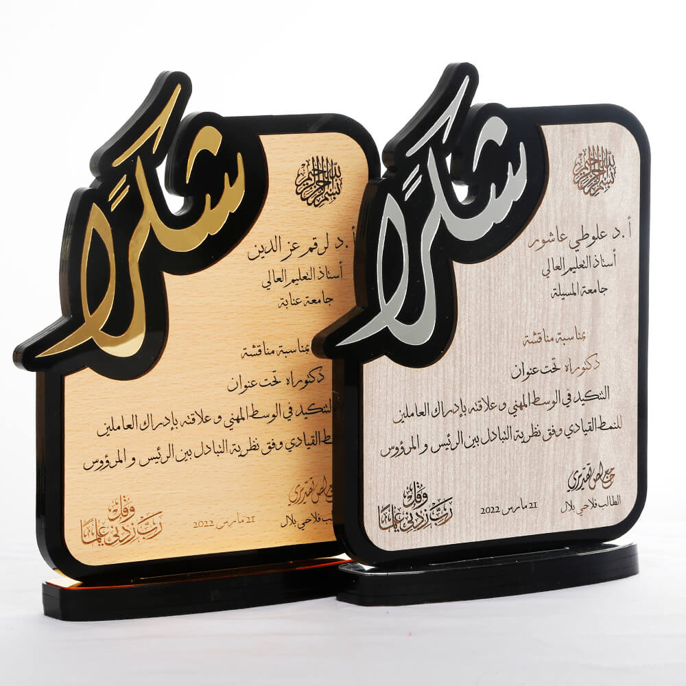 مصنوع من مادة الأكريليك الأسود مع واجهة من الديلوفان الذهبي الذي يمنحه لمعاناً جذاباً. تمت معالجة الكتابة بتقنية النحت (الحفر) لإبراز العبارات بشكل أنيق ودائم