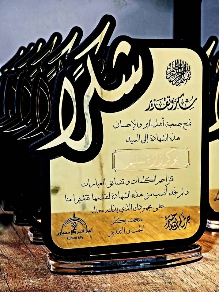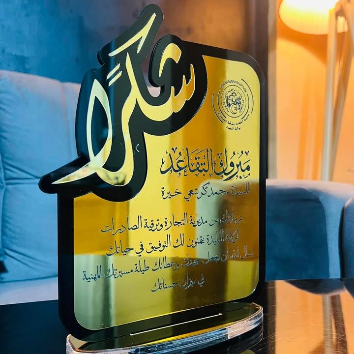 درع أنيق مصنوع بدقة عالية، يتميز بواجهة فاخرة تحمل عبارة "شكرًا" بحروف بارزة، مزينة بالحلي